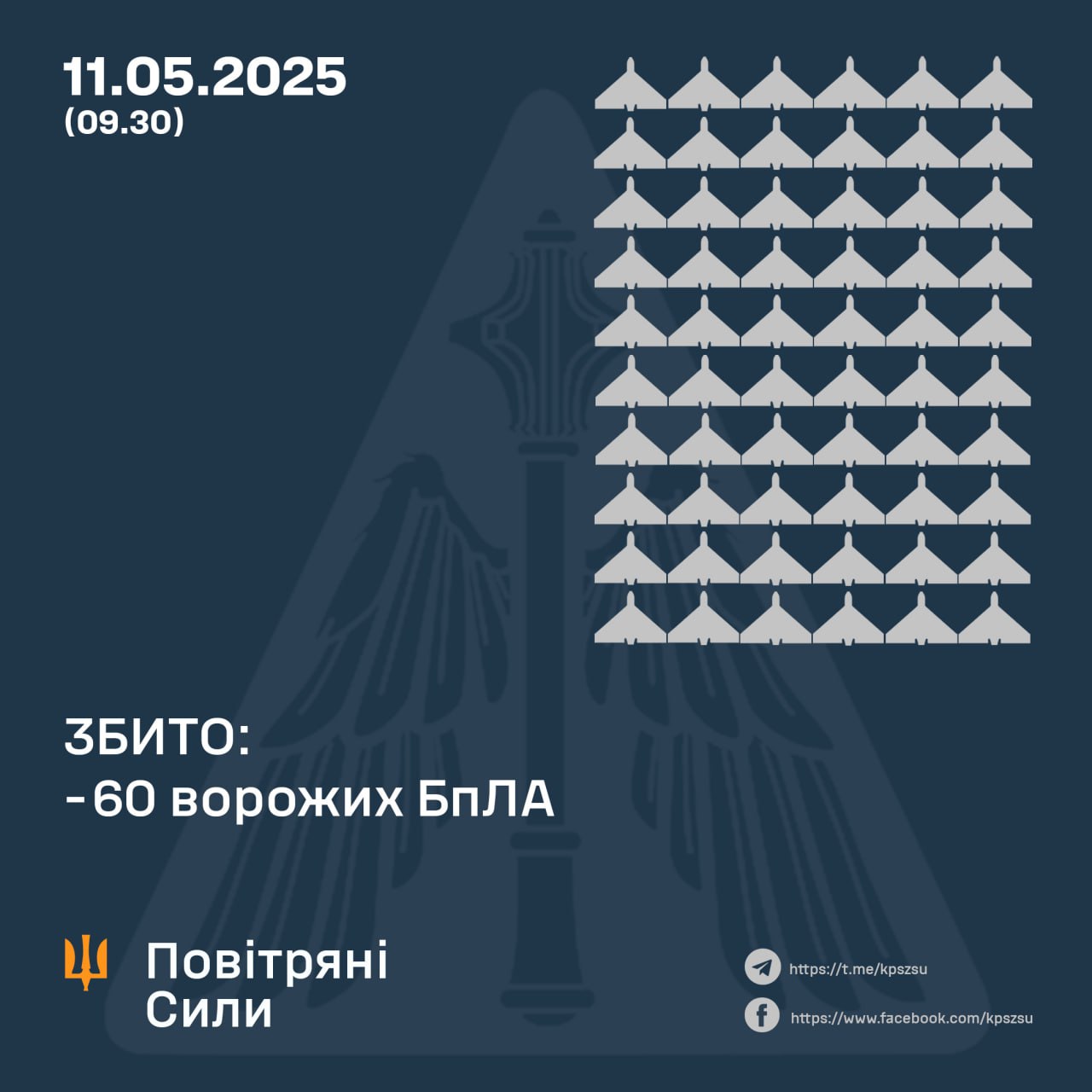 Масштабна атака дронами на Україну відбулася в ніч проти 11 травня. Російські сили спрямували 108 безпілотників із різних напрямків, зокрема з території Брянської області, Криму та тимчасово окупованої частини Запорізької області. Повітряні Сили ЗС України прозвітували про успішну протидію: знищено 60 ударних дронів Shahed, ще 41 безпілотник-імітація не досяг своїх цілей.
