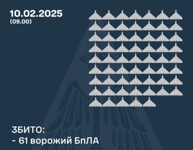 Станом на 09:00 українські сили збили 61 ворожий безпілотник, зокрема в: