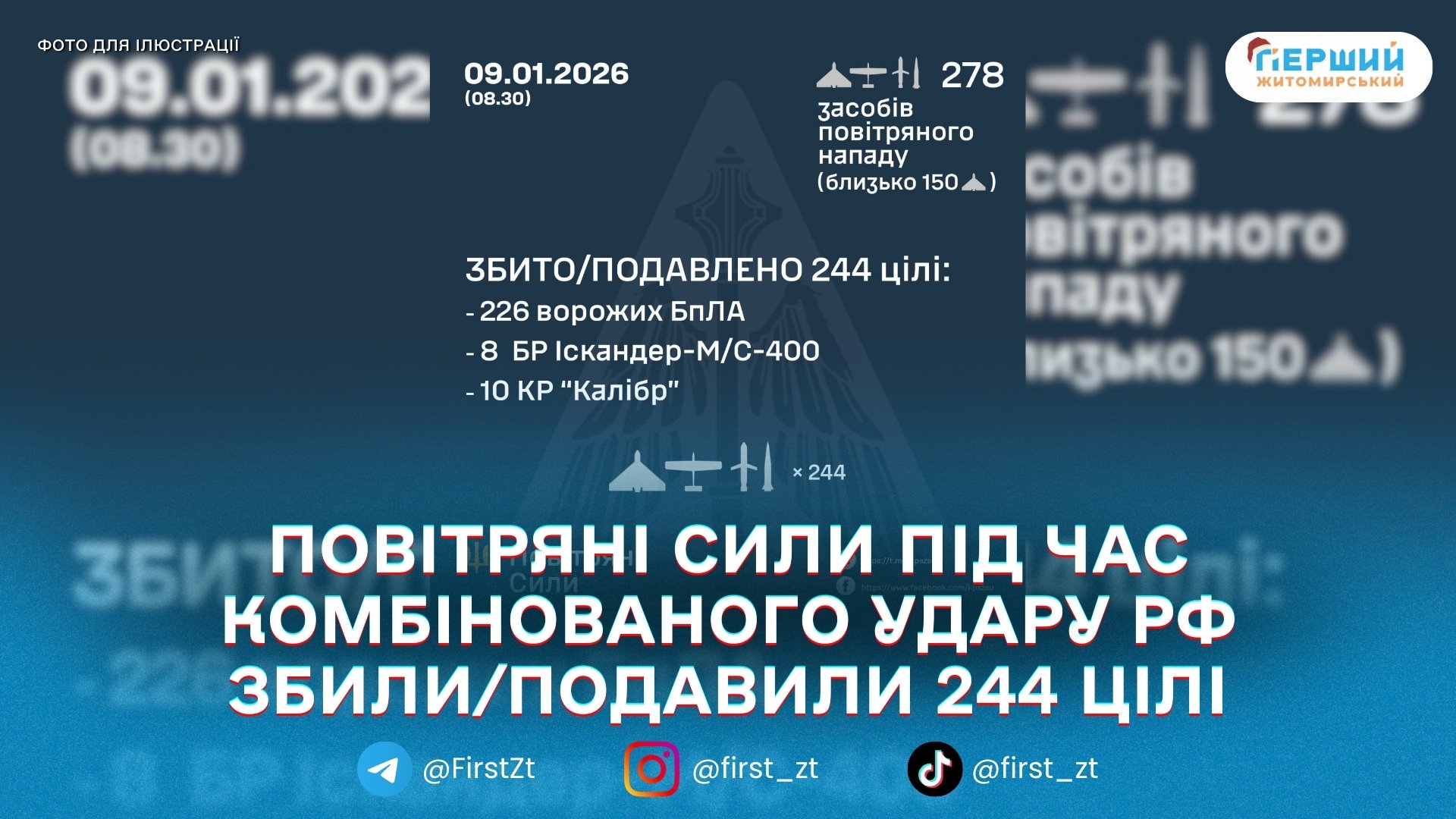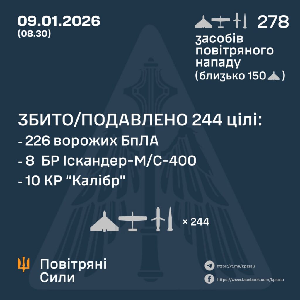 За попередніми даними станом на 09:00 протиповітряна оборона збила або подавила 244 повітряні цілі. Зокрема, йдеться про 226 безпілотників типу Shahed, «Гербера» та інших типів, 8 балістичних ракет «Іскандер-М/С-400» і 10 крилатих ракет «Калібр».