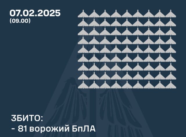 Станом на 09:00 українські сили збили 81 безпілотник, зокрема у: