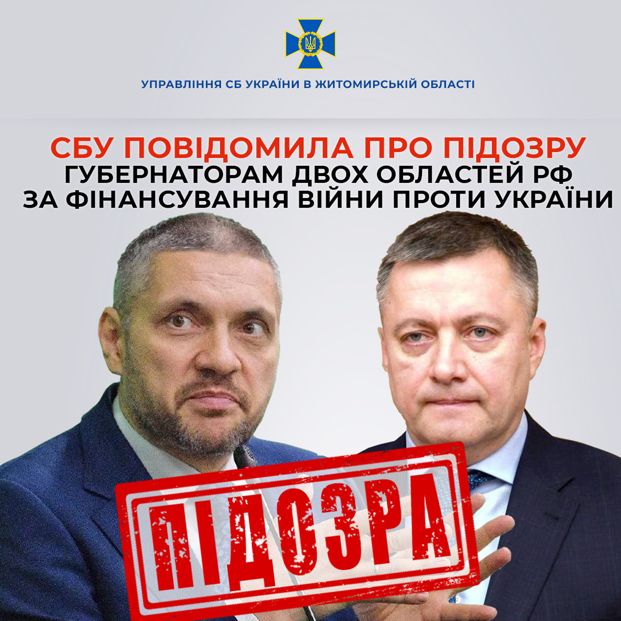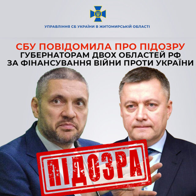 Служба безпеки України у Житомирській області зібрала докази причетності двох російських губернаторів до фінансування військових підрозділів рф, які ведуть бойові дії в Україні. Підозру заочно отримали очільник Іркутської області Ігор Кобзєв та губернатор Забайкальського краю Олександр Осіпов. Про це повідомило Управління СБУ в Житомирській області у своєму Facebook.