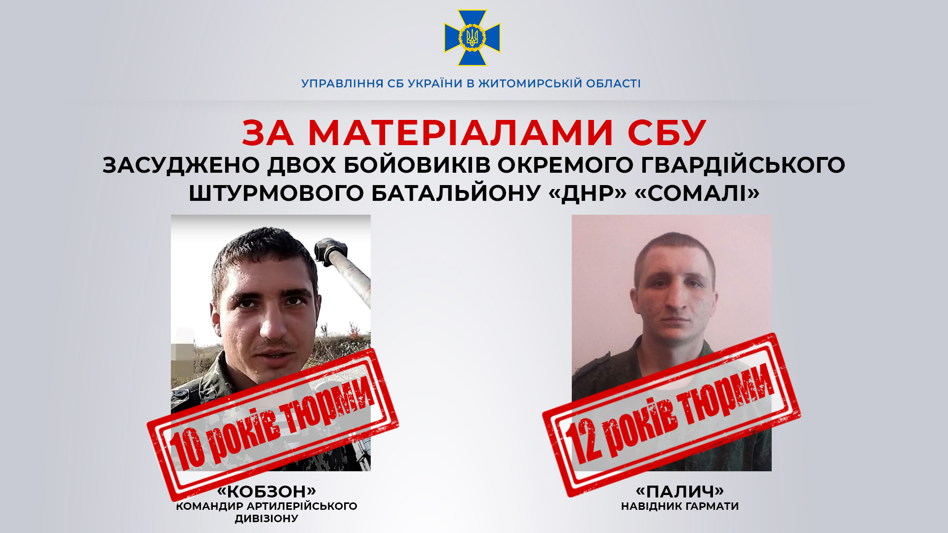 Так ще двоє засуджених – командир артилерійського дивізіону та навідник механізованої роти так званого батальйону «сомалі», які брали участь у війні на боці окупантів, отримають 10 та 12 років позбавлення волі. Про це повідомляє СБУ у Житомирській області.