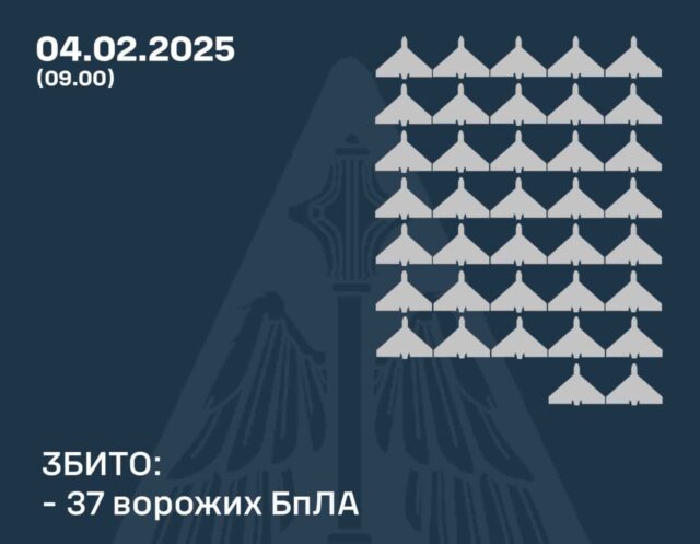 Станом на 09:00 ранку офіційно підтверджено знищення 37 ударних БпЛА типу «Shahed» та інших ворожих дронів у Полтавській, Сумській, Київській, Чернігівській та Черкаській областях.
