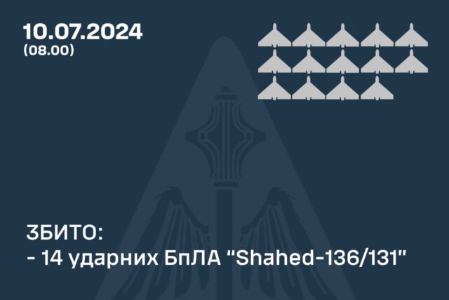 В результаті бойової роботи збито 14 «шахедів» у Одеській, Миколаївській, Херсонській, Дніпропетровській, Хмельницькій, Черкаській, Вінницькій та Рівненській областях.