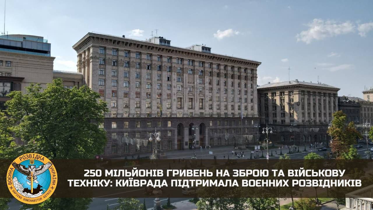 «Головне управління розвідки Міністерства оборони України отримає 250 мільйонів гривень з міського бюджету Києва. Депутати Київської міської ради днями проголосували за ініційоване міським головою Віталієм Кличком відповідне рішення. Перераховані фінансові ресурси будуть спрямовані на закупівлю зброї, військової техніки та обладнання з метою посилення ефективності бойових завдань, які цілодобово виконують українські розвідники на війні з російським агресором», – йдеться в повідомленні ГУР.