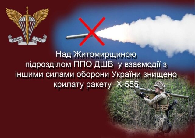 “Під час масованої ракетної атаки по всій території України російським агресором з різних напрямків крилатими ракетами повітряного та морського базування, зенітним ракетним підрозділом Десантно-штурмових військ у взаємодії з іншими силами та засобами ППО сил оборони України, в небі над Житомирщиною збито крилату ракету Х-555“, – йдеться в повідомленні.