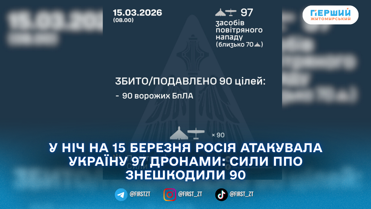 У ніч на 15 березня, починаючи з 18:00 14 березня, російські війська атакували Україну 97 ударними безпілотниками типу Shahed, «Гербера», «Італмас» та дронами інших типів. Близько 70 із них були «шахедами». Пуски фіксували з напрямків Брянськ, Орел, Курськ, Міллєрово в РФ, а також із Гвардійського у тимчасово окупованому Криму.