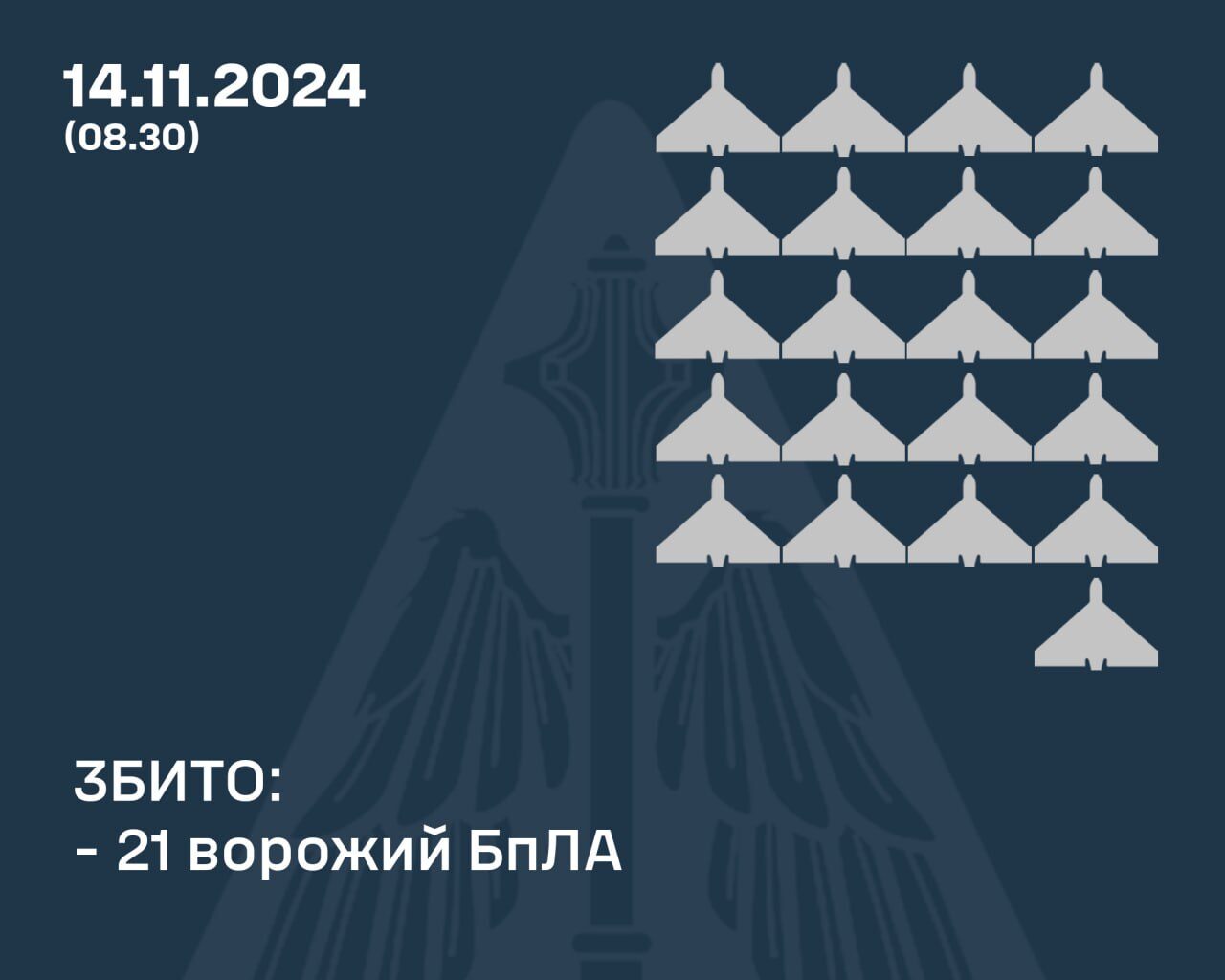 Масована атака на Україну У ніч на 14 листопада 2024 року, починаючи з 19:00, російські сили здійснили масовану атаку на Україну, запустивши 59 ударних безпілотних літальних апаратів (БПЛА) типу «Shahed» та безпілотників невстановленого типу з району Курська. Про це повідомляють Повітряні сили ЗС України.