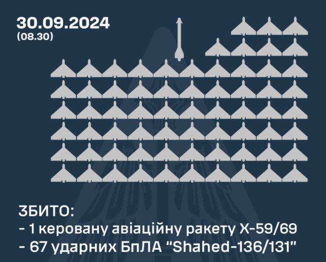 У ніч на 30 вересня 2024 року ворог завдав чергового удару по Україні, використовуючи ракети різних типів та ударні безпілотники. З 19:00 29 вересня до 08:00 30 вересня радіотехнічні війська Повітряних Сил зафіксували та супроводили 76 повітряних об’єктів противника.