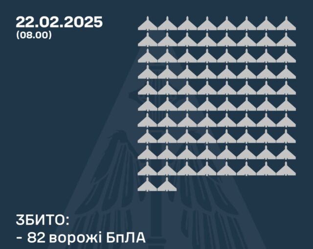 82 ударні безпілотники знищено в Харківській, Полтавській, Сумській, Київській, Чернігівській, Черкаській, Кіровоградській, Житомирській, Вінницькій, Миколаївській, Херсонській, Запорізькій та Дніпропетровській областях.