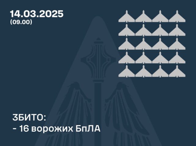 Захист українського неба забезпечували мобільні вогневі групи Повітряних Сил та Сил оборони України. Станом на 09:00 підтверджено збиття 16 ударних БПЛА типу Shahed у Дніпропетровській, Запорізькій, Донецькій та Харківській областях.