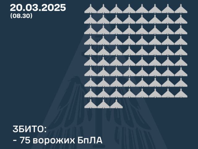 Станом на 08:30 підтверджено знищення 75 ударних БпЛА типу Shahed та безпілотників інших типів. Дрони були збиті в таких областях: