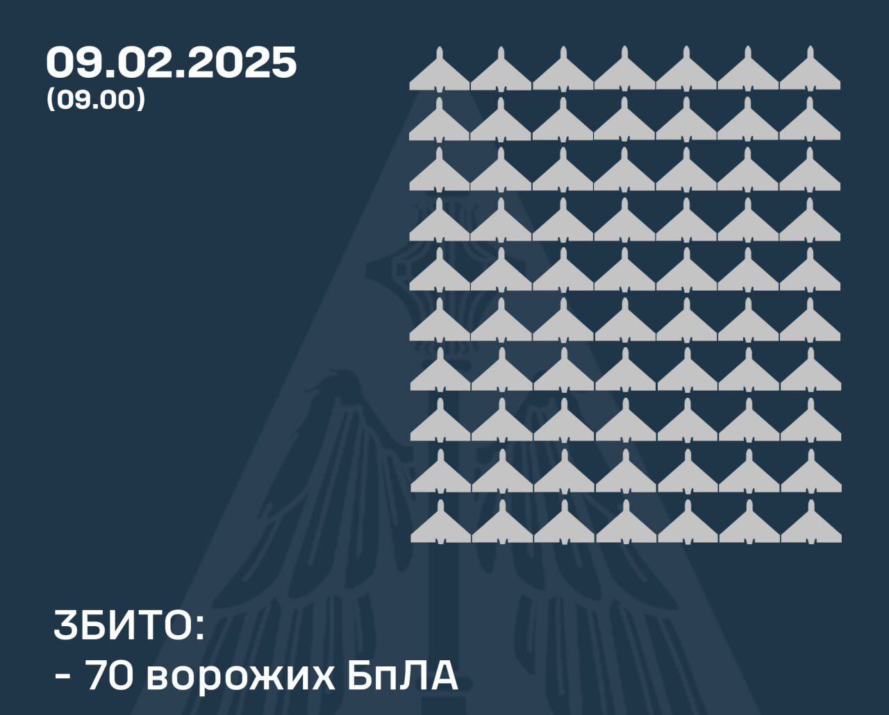 Станом на 09:00 підтверджено збиття 70 ударних дронів у Київській, Харківській, Полтавській, Сумській, Черкаській, Чернігівській, Кіровоградській, Вінницькій, Житомирській, Рівненській, Волинській, Миколаївській, Херсонській та Одеській областях.