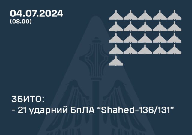 Завдяки злагодженій роботі зенітних ракетних підрозділів, розрахунків мобільних вогневих груп Сил оборони та засобів радіоелектронної боротьби Повітряних Сил Збройних Сил України було збито 21 «шахед» у Київській, Чернігівській, Житомирській, Сумській, Дніпропетровській та Полтавській областях.