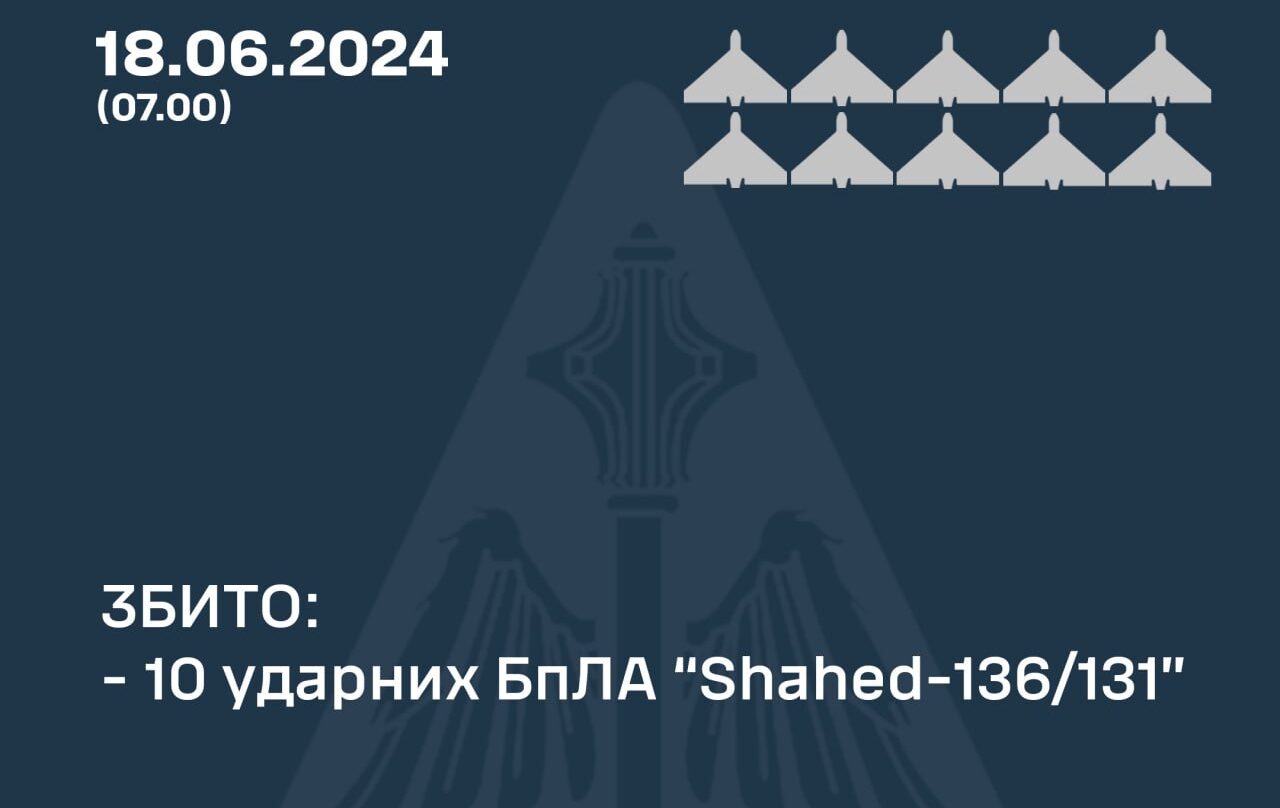 У ніч на 18 червня 2024 року противник атакував десятьма ударними БпЛА типу «Shahed-131/136» з району Приморсько-Ахтарськ – рф.