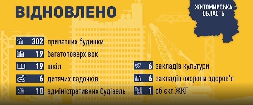 На Житомирщині вже відновили 388 об’єктів, які зруйнували росіяни авіа та ракетними ударами. Майже повністю відновлені приватні забудови.