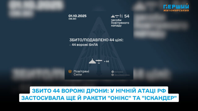 Станом на 09:30 1 жовтня підтверджено знищення та подавлення 44 ударних дронів різних типів. Зафіксовані також влучання 5 ракет та БпЛА у шести локаціях на півночі, сході та в центрі країни.