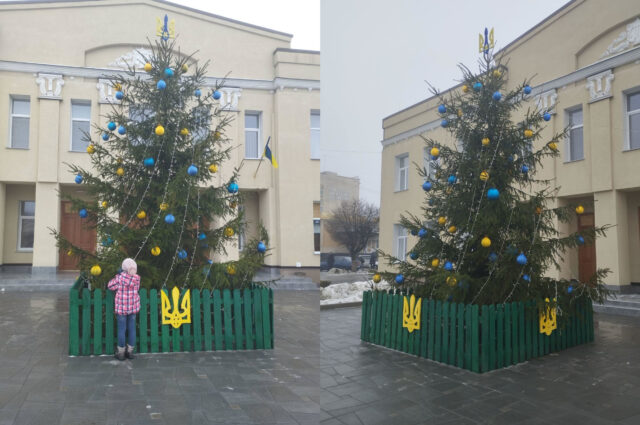 Новорічне дерево прикрасили іграшками у патріотичних кольорах, а на верхівці замість традиційної зірки, встановили – тризуб.