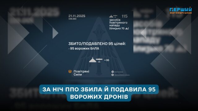 У ніч на 21 листопада російська армія атакувала Україну 115 ударними безпілотниками. За даними Повітряних Сил ЗСУ, протиповітряна оборона збила й подавила 95 ворожих БПЛА типу Shahed, «Гербера» та дронів інших типів.