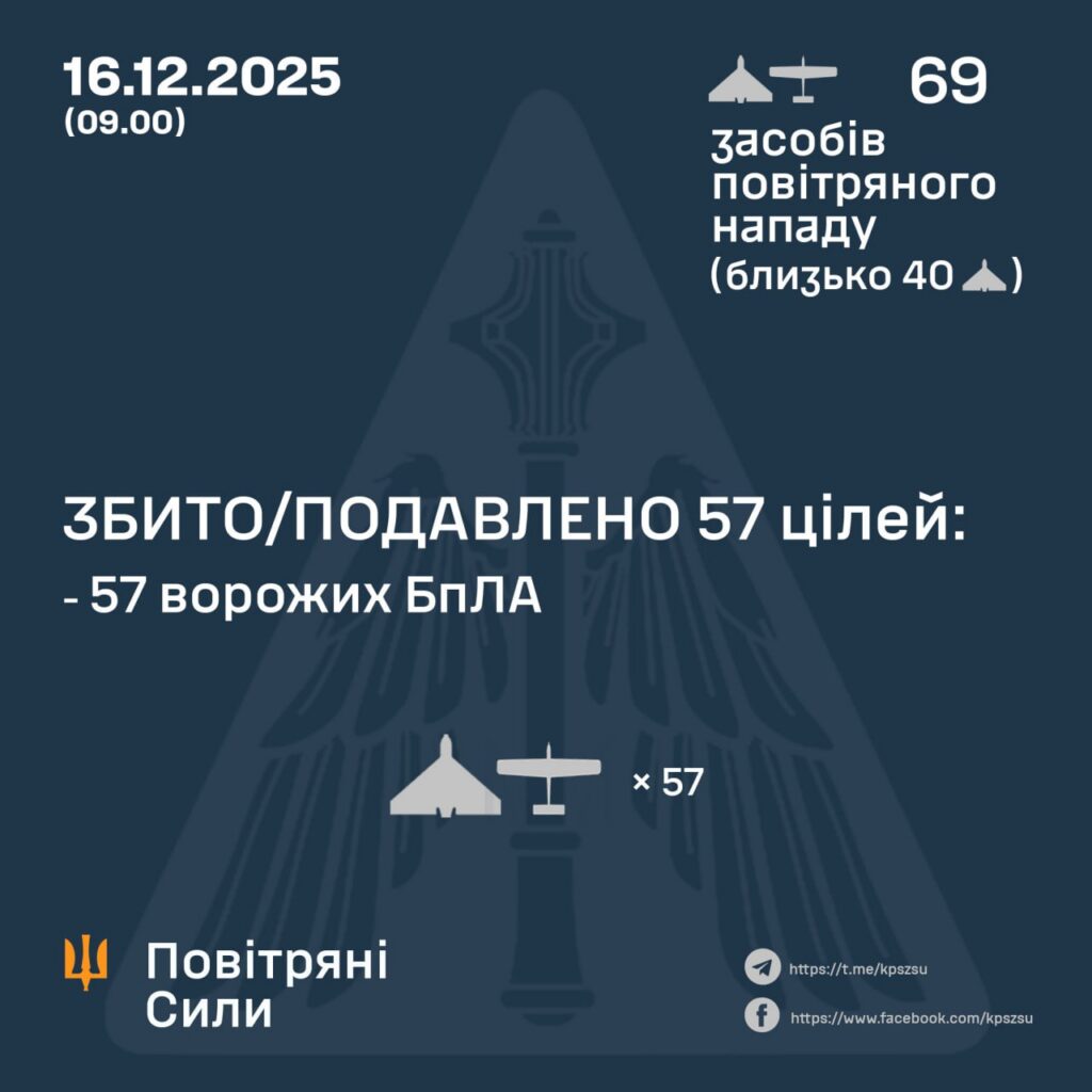 У ніч на 16 грудня російські війська здійснили чергову атаку ударними безпілотниками по території України. За даними Повітряних Сил Збройних сил України, загалом було запущено 69 дронів типу Shahed, «Гербера» та безпілотників інших типів.