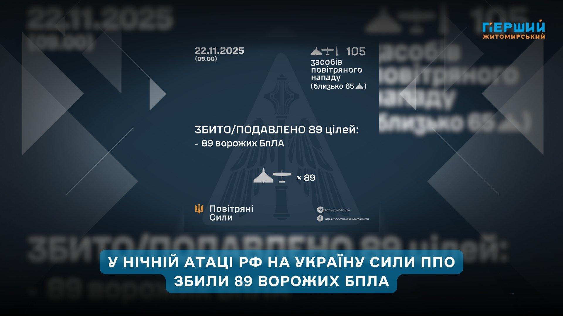 У ніч на 22 листопада сили протиповітряної оборони України збили 89 ворожих БпЛА з 104, якими росія атакувала територію країни. Крім дронів, з тимчасово окупованого Криму було запущено одну балістичну ракету «Іскандер-М». Про це повідомили у Повітряних Силах ЗСУ.