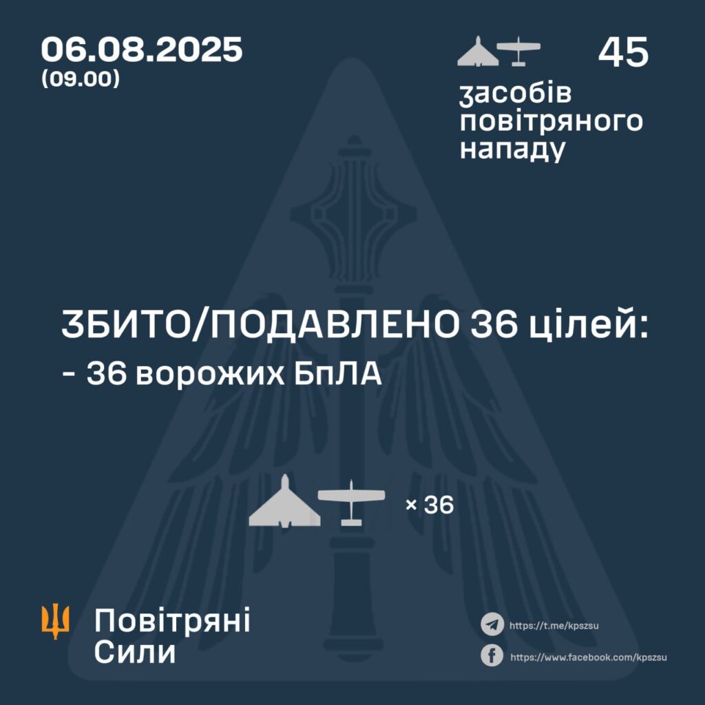 За попередніми даними, станом на 9:00 протиповітряною обороною України було знищено або подавлено 36 Shahed та дронів-імітацій. Роботу ППО зафіксовано на північному, південному та східному напрямках.
