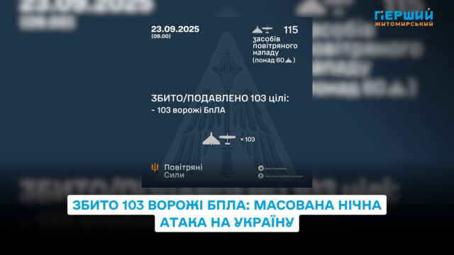 У ніч на 23 вересня російські війська здійснили масовану атаку по території України. Вони застосували 3 балістичні ракети та 115 ударних безпілотників різних типів. Про це повідомили у Повітряних силах ЗСУ.