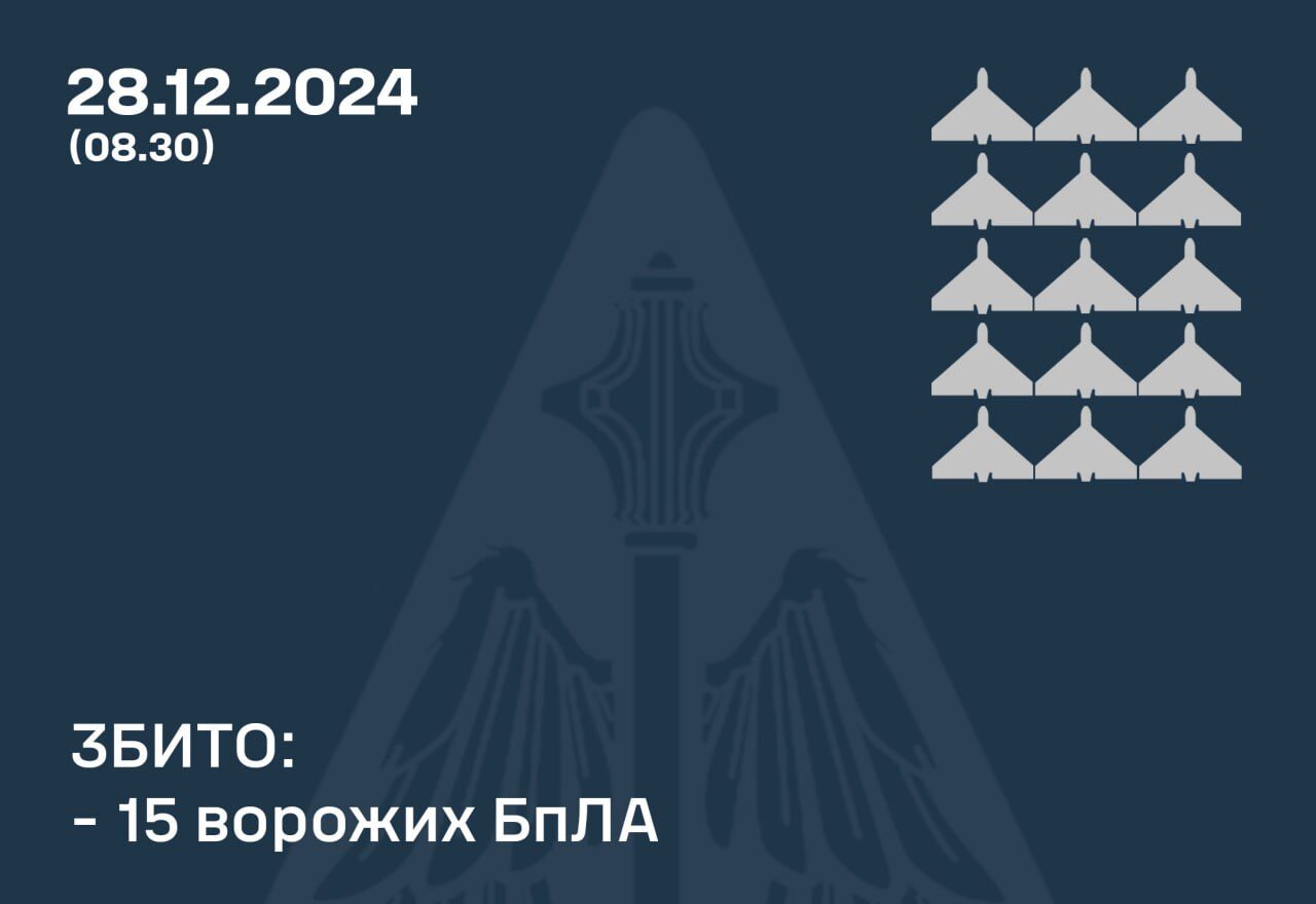 У ніч на 28 грудня 2024 року російські війська атакували Україну 16-ма ударними безпілотниками типу «Shahed» та іншими дронами. Район запуску – Приморсько-Ахтарськ, рф. Про це повідомляють Повітряні сили України.