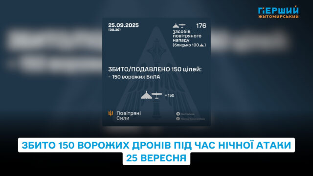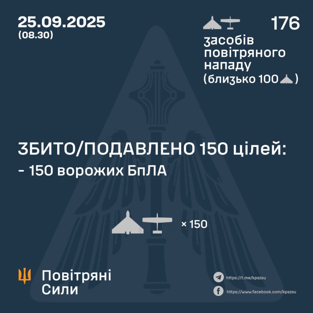 У ніч на 25 вересня російські війська здійснили чергову масовану атаку дронами-камікадзе по території України. Загалом було запущено 176 ударних БпЛА типів Shahed, «Гербера» та інших. Про це повідомили у Повітряних Силах ЗСУ.