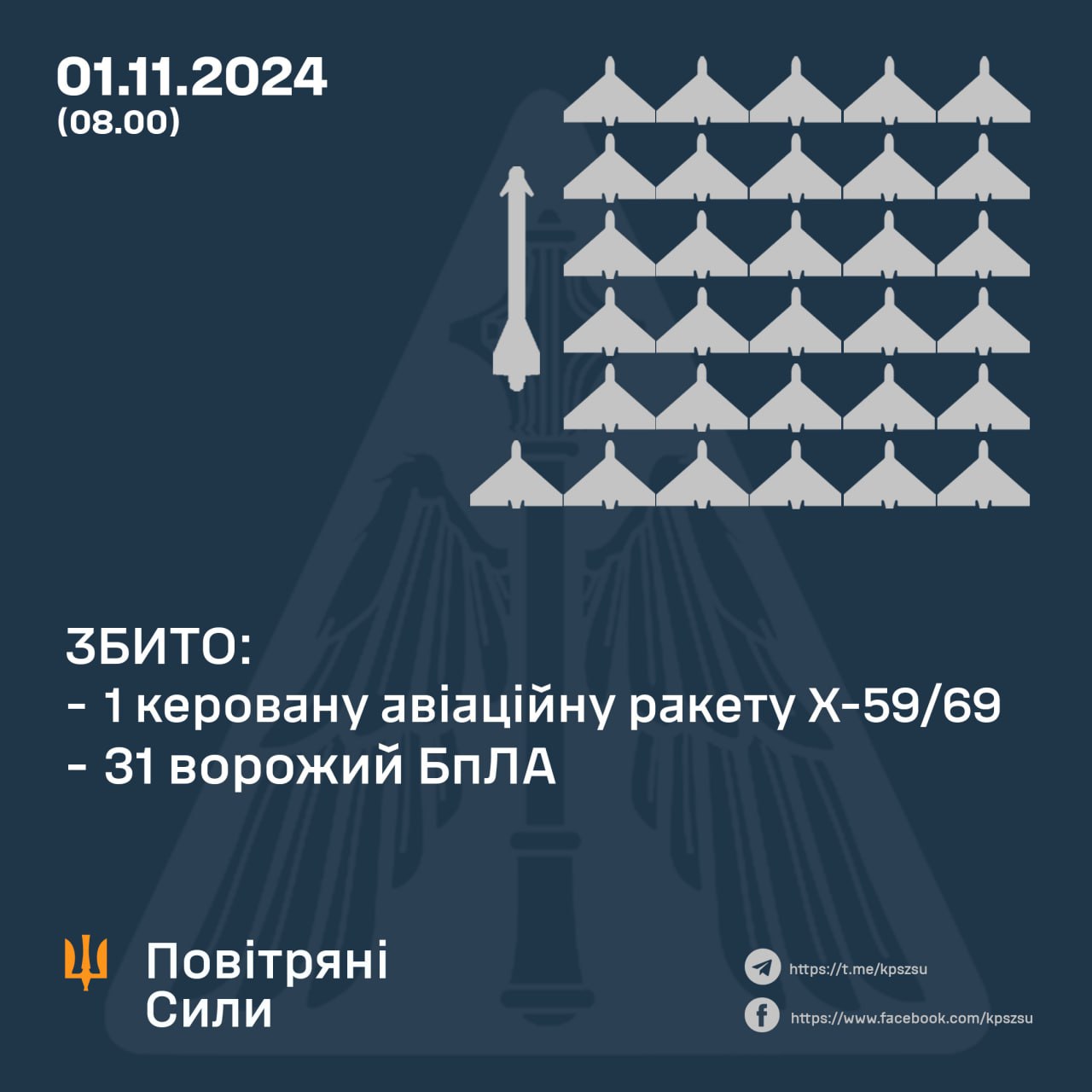 У ніч на 1 листопада російські сили здійснили масовану атаку по Україні, використовуючи три керовані авіаційні ракети типу Х-59/69. Також були запущені з тимчасово окупованої Херсонщини, та 48 ударних безпілотників типу «Shahed». Атака також супроводжувалася ударами по Харківщині, Сумщині та Запоріжжю за допомогою керованих авіабомб.