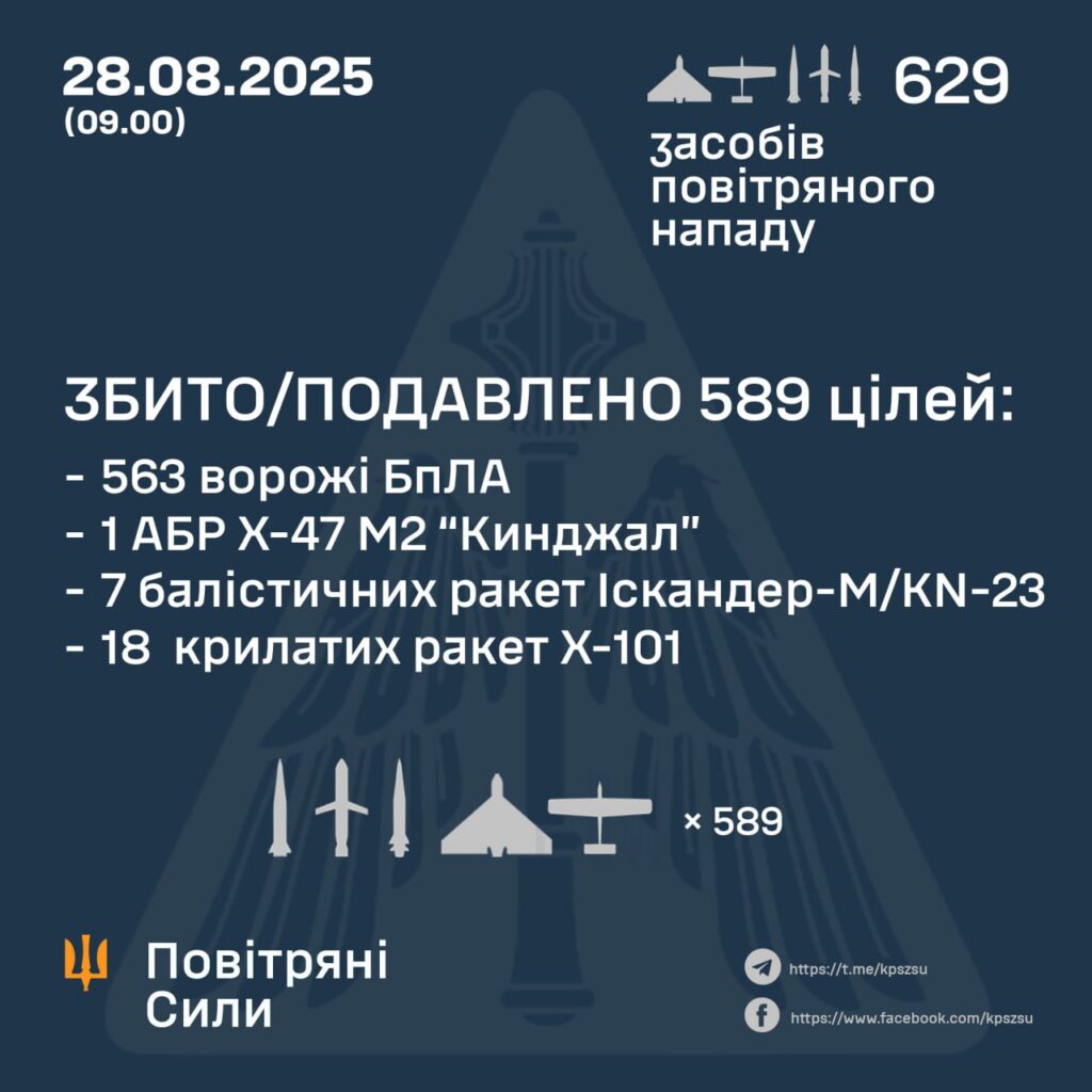 У ніч на 28 серпня росія здійснила один із наймасованіших повітряних ударів по Україні. Загалом застосовано 629 засобів повітряного нападу – від ударних дронів Shahed до ракет «Кинджал» та «Іскандер». Про це повідомили у Повітряних Силах ЗСУ.