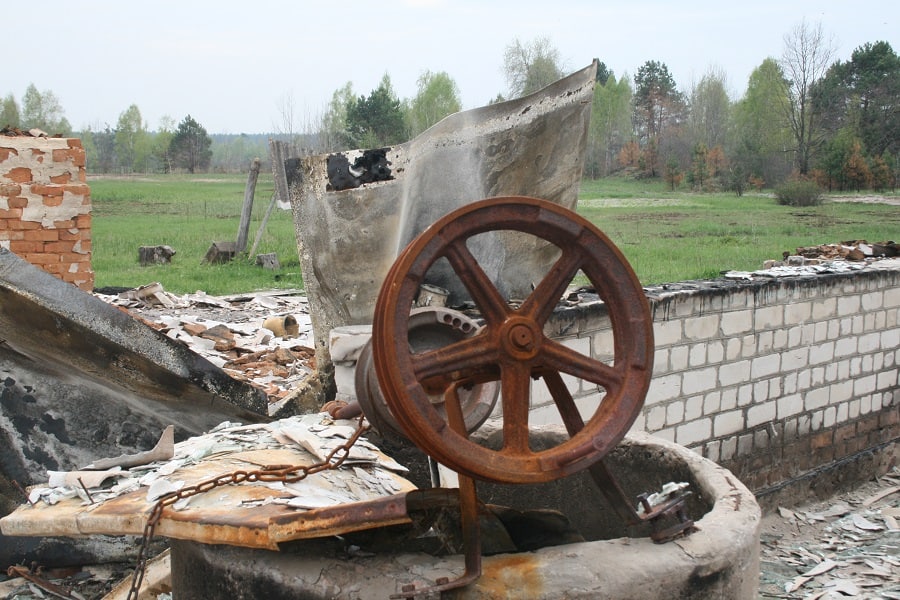 На початку села надпис з назвою населеного пукту. Далі декілька вцілілих житлових будинків і цілі кілометри вулиць вщент знищених.