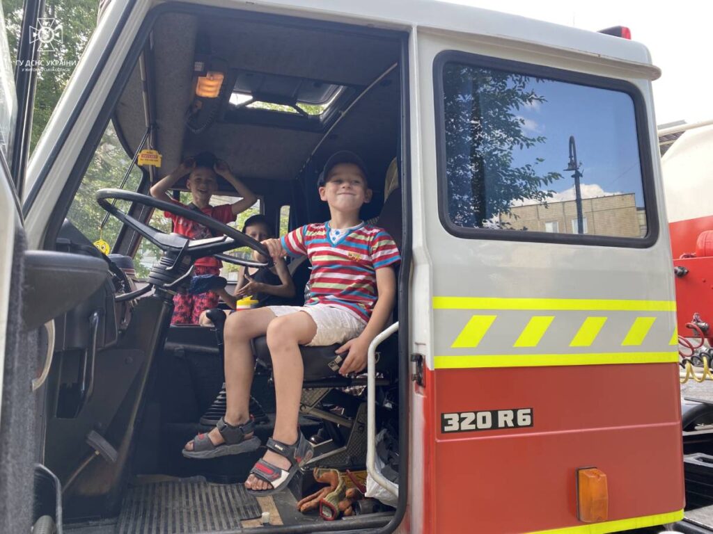“Юні нікопольці не втрачають можливості поспілкуватися з рятувальниками Житомирщини, посидіти за кермом спецавтівки і пофоткатися”, – додали в ДСНС.