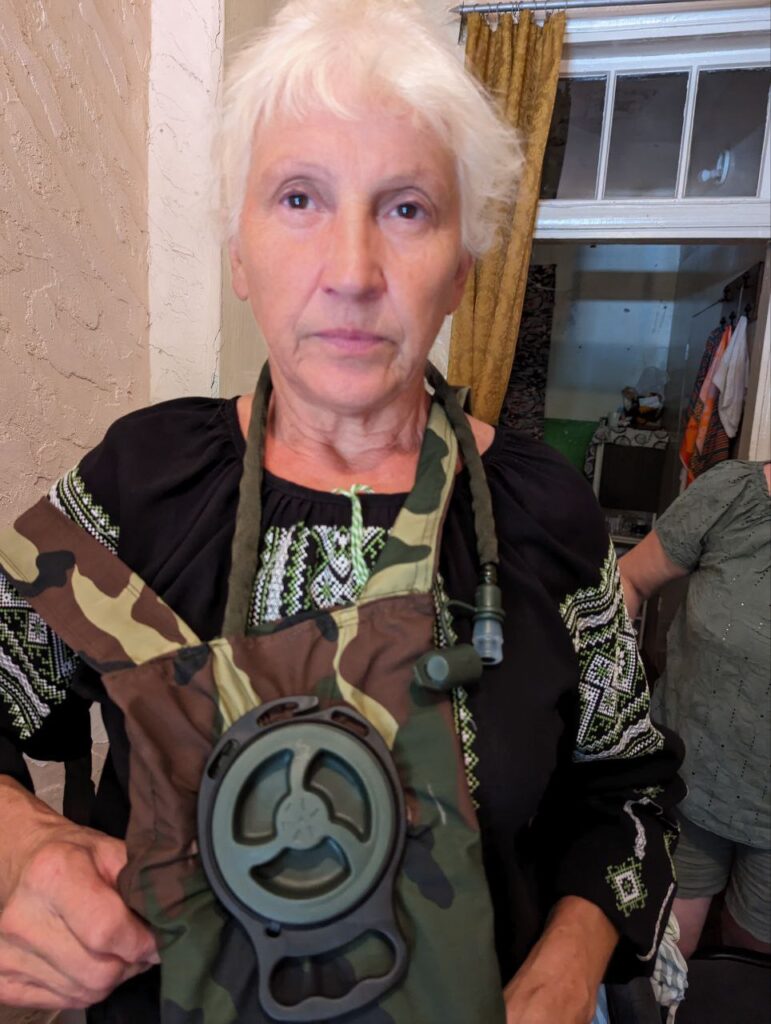 Представниці Житомирського відділення Всеукраїнської благодійної організації “Турбота про літніх людей в Україні” уже пошили 4 вироби, які успішно пройшли випробування реаліями на східних напрямках. Волонтерки демонструють, як простіше стає пити воду.