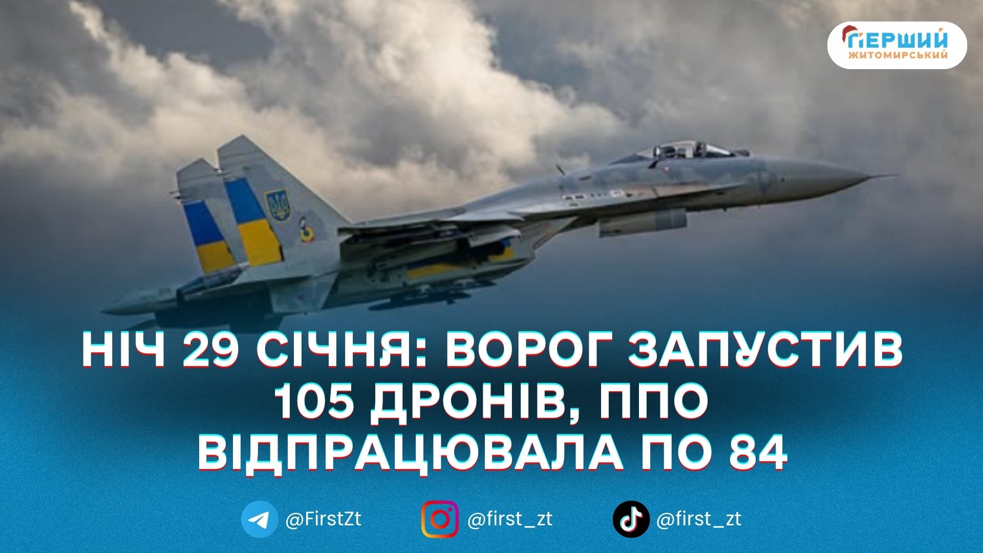 У ніч на 29 січня (із 18:00 28 січня) Росія атакувала Україну 105 ударними БпЛА типу Shahed, а також «Гербера», «Італмас» і безпілотниками інших типів. Про це повідомили Повітряні Сили ЗСУ.