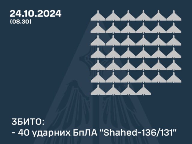 Станом на 8:30 ранку 24 жовтня було підтверджено збиття 40 ворожих БПЛА в Одеській, Миколаївській, Дніпропетровській, Вінницькій, Житомирській, Хмельницькій, Черкаській, Кіровоградській, Київській, Полтавській та Чернігівській областях.