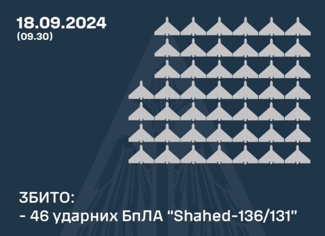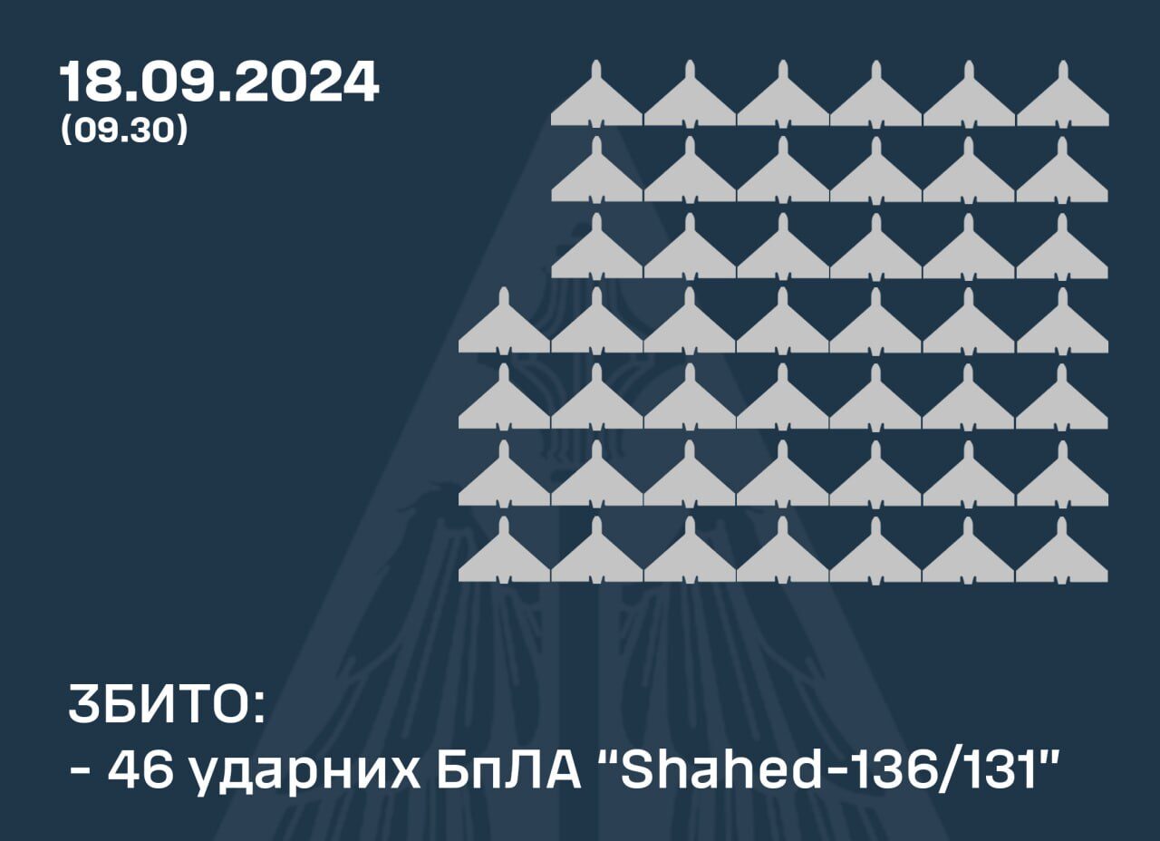 Збройні Сили України оперативно відреагували на атаку. До відбиття повітряного удару залучили авіацію, мобільні вогневі групи та підрозділи радіоелектронної боротьби (РЕБ). Завдяки злагодженій роботі Сил оборони було знищено 46 ударних безпілотників.