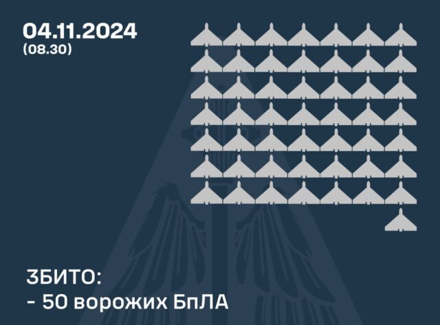 Зенітні ракетні війська, авіація, підрозділи радіоелектронної боротьби та мобільні вогневі групи Повітряних Сил і Сил оборони України відбивали повітряну атаку. Станом на 08:30 було підтверджено збиття 50 ворожих безпілотників над Київською, Сумською, Одеською, Херсонською, Миколаївською, Житомирською, Черкаською, Чернігівською та Кіровоградською областями.