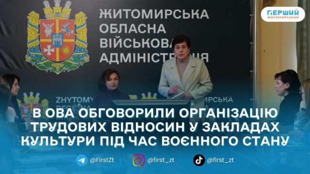 11 лютого в ЖОВА відбулася робоча нарада для керівників підвідомчих закладів культури на тему «Організація трудових відносин в умовах воєнного стану». Захід організувало Управління культури та туризму Житомирської ОВА. Про це повідомила пресслужба структури.