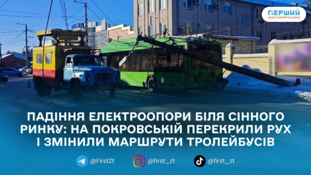 У Житомирі на вулиці Покровській поблизу Сінного ринку впала електроопора. Через це рух транспорту тимчасово перекрили в обох напрямках.
