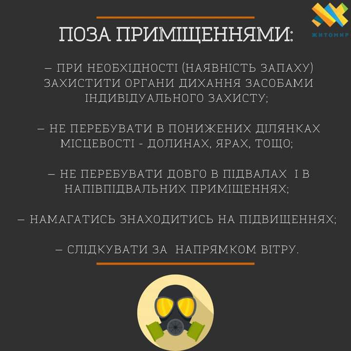- при появі запаху використовувати засоби захисту органів дихання можна використовувати ватно-марлеву пов’язку змочено 2%-М розчином питної соди.