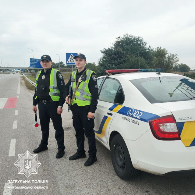 “На цьому фото житомирські патрульні Валентин Лось та Ярослав Піонтківський, що надавали допомогу водію, якому раптово стало зле.