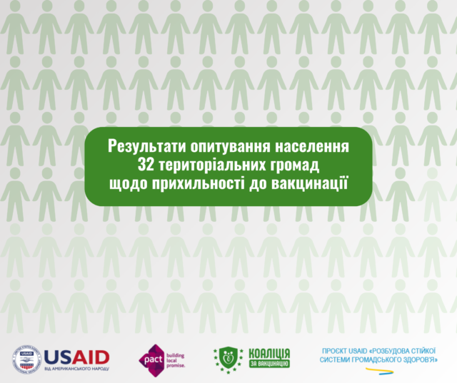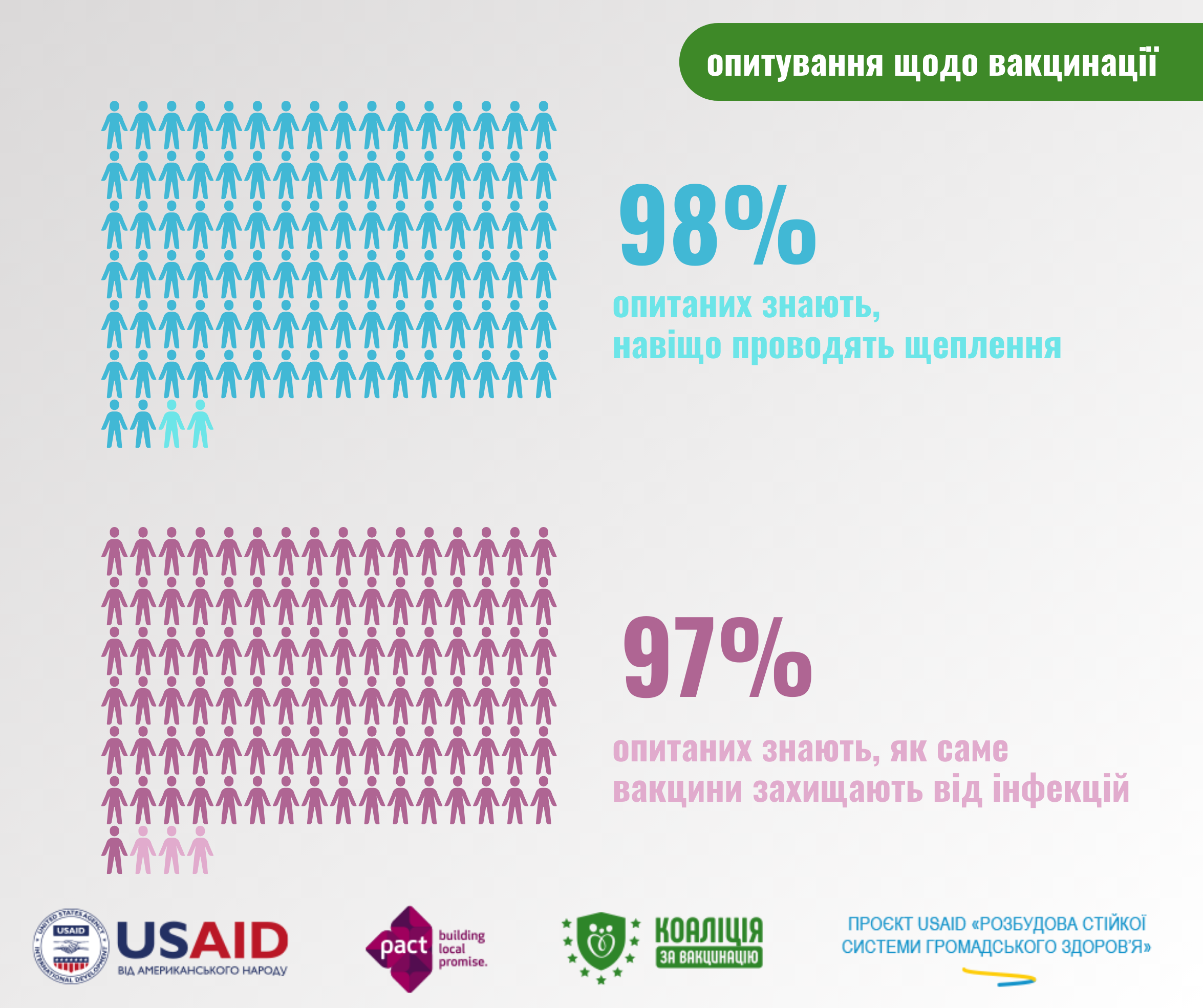 ГС “Коаліція за вакцинацію” провела онлайн-опитування у 32 територіальних громадах восьми областей України (Вінницької, Житомирської, Івано-Франківської, Київської, Одеської, Тернопільської, Чернівецької та Чернігівської), де реалізується проєкт USAID “Розбудова стійкої системи громадського здоров’я”. Участь в опитуванні взяли 2 752 особи від 18 років, у тому числі освітяни та батьки, представники сільськогосподарської та виробничої сфер. В Житомирській області опитування проводили у таких громадах: Чуднівська, Станишівська, Звягельська, Баранівська. Респондентам пропонувались 11 запитань, які розкривають їхнє ставлення до вакцинації, обізнаність щодо механізму дії вакцин, досвід отримання щеплень та потребу в інформації про вакцинацію.
