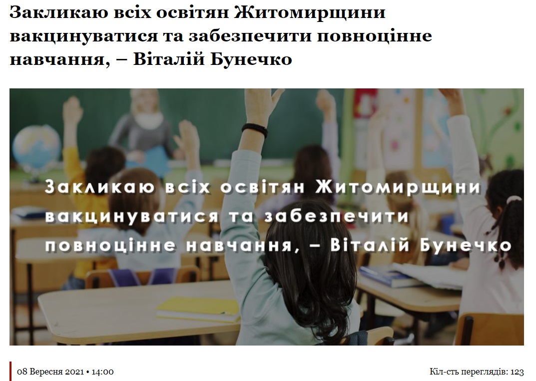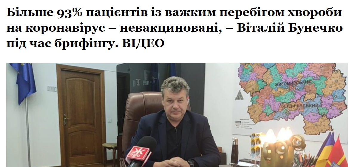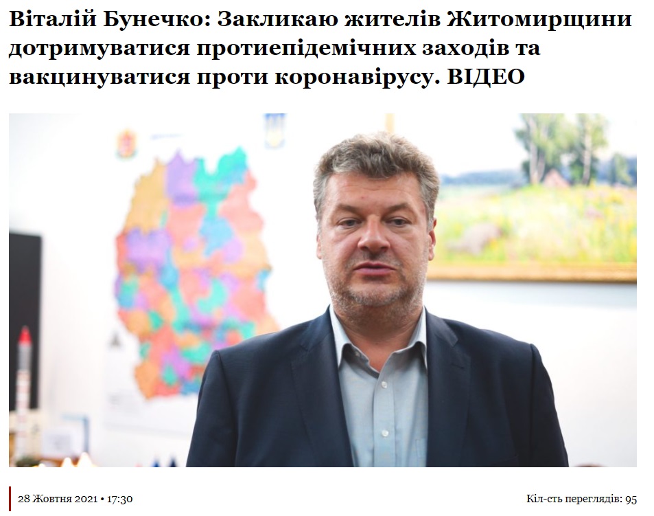 Голова Житомирської ОДА Віталій Бунечко часто називав райони-аутсайдери вакцинації, закликав освітян та населення колоти вакцину і в той же час сам був невакцинований. Він зустрічався зі спортсменами, громадськістю, відвідував масові заходи, пологові будинки.